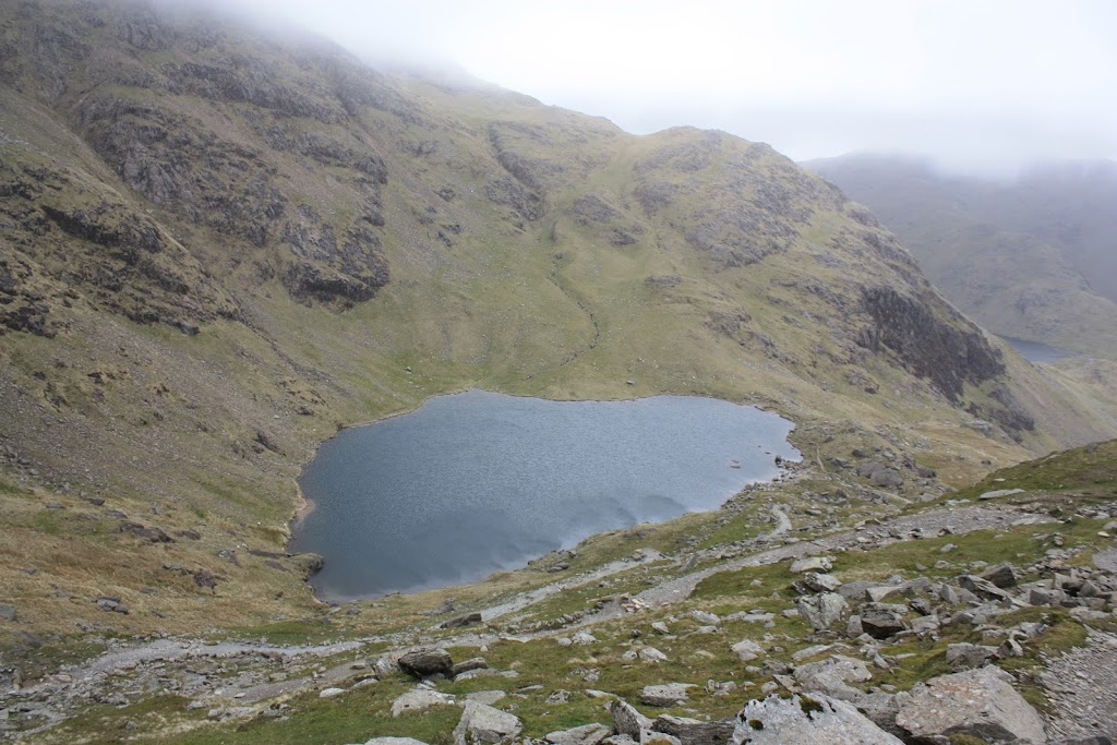 I set out from the village green in reasonable sunshine and ascended past The Sun hotel, the path ran alongside the fast flowing Church Beck and up towards the ruins of the old coppermines now home to a YHA and some beautifully situated holiday homes. There were plenty of Herdwick Sheep and every stream was full of water swelling the falls into picturesquely spectacular cataracts. The steady climb upwards took me through the abandoned slate workings and up into the clouds before stopping for lunch at Low Water, a well situated tarn at the bottom of a bowl below the Old Man. The path to the summit took me into the clouds as it zig zagged up the side with occasional views back towards the village and the lake. The summit was wind blasted and the cloud was down so after a brief stop for the obligatory photo it was onwards along the ridge before dropping down to Goat Hause and then after a steep descent to the moodily situated Goat Water in the valley between the Old Man and the forbidding rockfaces of Dow Crag. I continued onto Little Arrow Moor and across the Walna Scar Road before hitting another quarry (complete with spectacular waterfall) and then continuing onto the village of Torver.