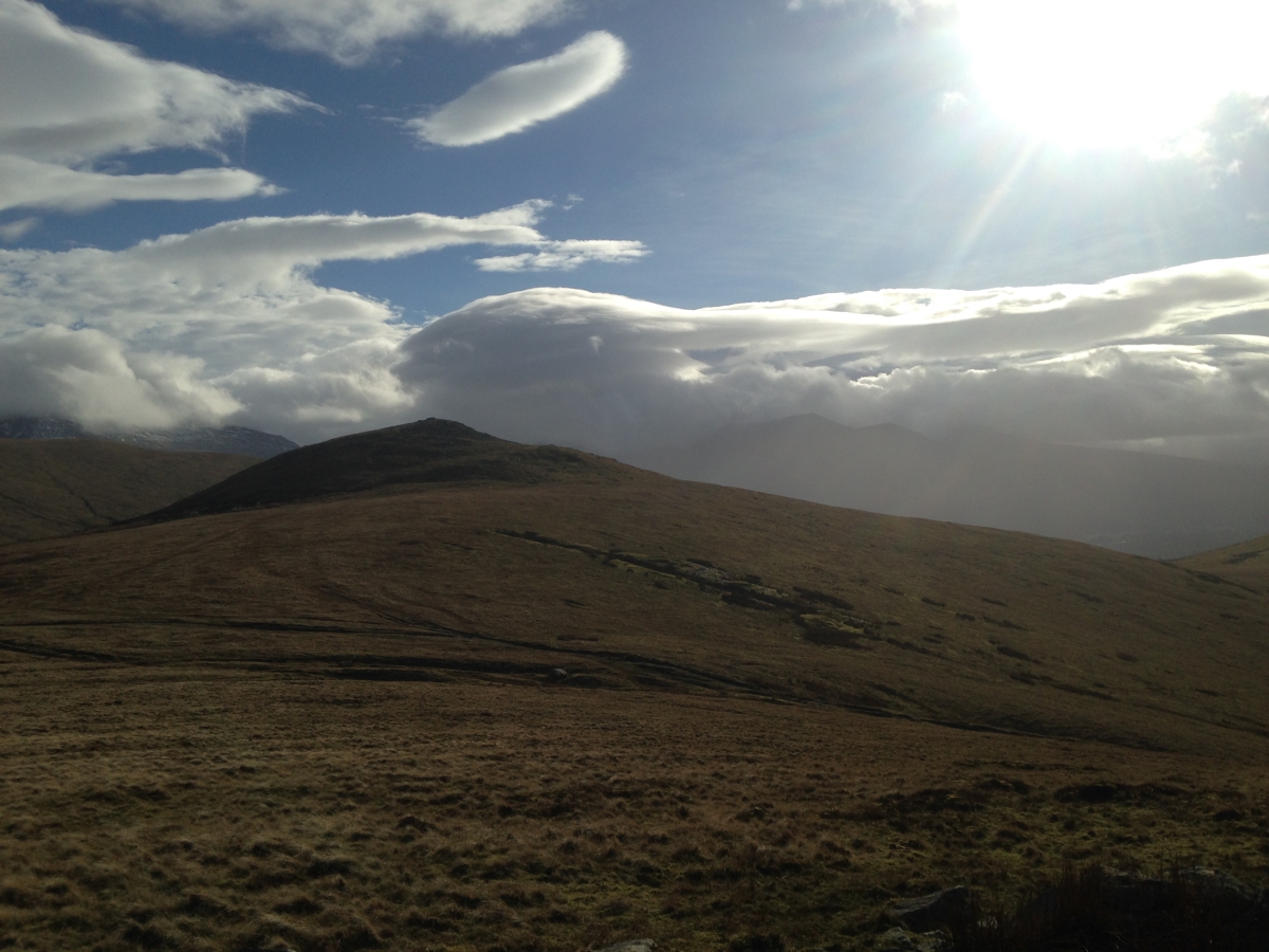 There are some places you come across and find yourself thinking “Why have I never even heard of this place before, let alone visited”, that was exactly how I felt as I came face to face with Aber Falls. I’d parked in the village of Abergwyngregyn and made my way along narrow country lanes following the route of Afon Aber. My route then left the road and continued to follow the line of the valley as it gradually climbed towards the falls. Being half term the path was busy with other walkers, but even the (smallish) crowds couldn’t take away from the grandeur of the falls where the Afon Goch drops 120 feet over the sheer rock face. I left the Falls on the North Wales Path and crossed into open country at the foot of the valley below Moel Wnion. It was rough, pathless walking as I contoured round the hillside with deep gouges in the land necessitating the occasional diversion and spectacular cloud formations looming ahead. Eventually I rounded the hill and was greeted with the sight of the spectacular sheepfolds that flank the lower slopes of Gyrn. After grabbing a sandwich on the summit, where a small shelter provided welcome respite from the buffeting wind, I continued across the Llefn and onto Moel Faban. Moel Faban is dotted with cairns and ruins which are thought by many to date from the Iron Age. There is certainly plenty of evidence around and with the cloud low and the snow topped Carneddau in the distance it was a very atmospheric spot for a second lunch. In the distance the mass of back lit cloud over the quarry beyond Bethesda made it look like something out of Tolkein, a Welsh Mordor if you like.