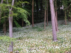 We headed North out of Pickering following the road past the train station and the old trout farm before passing the splendid looking Bed and Breakfast at Lowther House. We followed a path that skirted Pickering Woods (owned by the Duchy of Lancaster) and ran along the length of the brook. It was shady walking with the fragrance of thousands of Wild Garlic plants assailing our nostrils and birds and butterflies galore. The path took us round some flood reduction work which somewhat removed the air of rural idyll, but we left it behind and followed the path until it took across the railway line used by the North Yorkshire Moors Railway. We were treated to a steam train in full view which was great and then followed the path that tracked the railway line back to the railway crossing adjacent to Lowther House. A short walk later we were back in the town and dragging a reluctant Mrs H out of the pub.